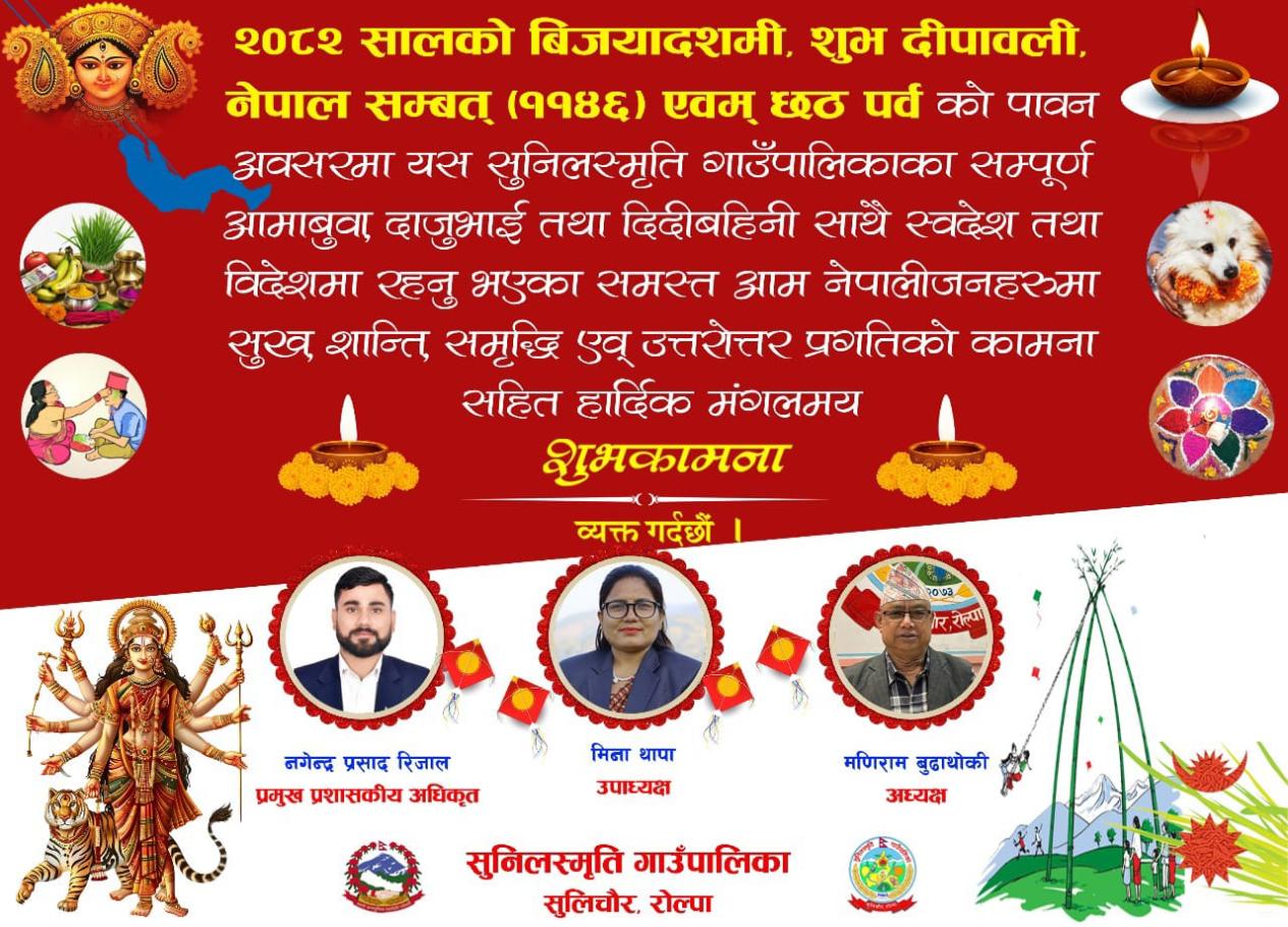 २०८२ सालको बिजयादशमी, शुभ दीपावली, नेपाल सम्बत् (११४६) एवम् छठ पर्व को पावन अवसरमा हार्दिक शुभकामना ।
