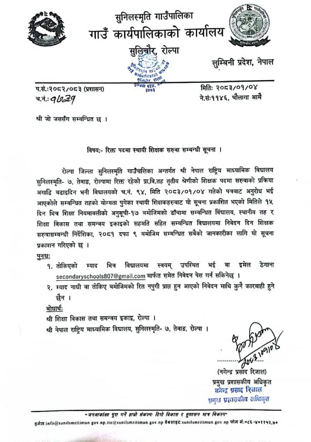 रिक्त पदमा स्थायी शिक्षक सरुवा सम्बन्धी सूचना ।