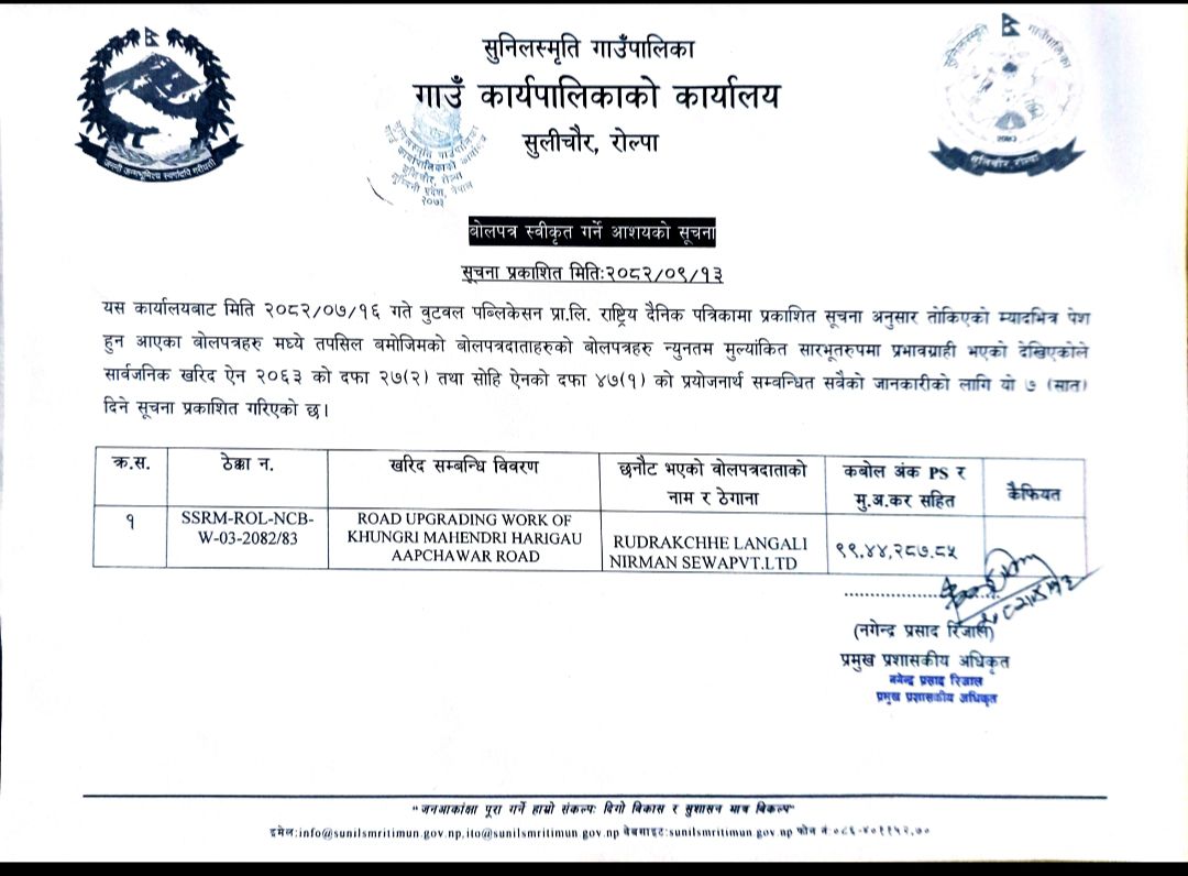 ११।१४ बोलपत्र स्वीकृत गर्ने आशयको सूचना ।